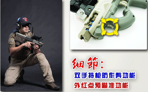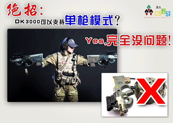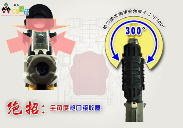 東莞真人CS野戰(zhàn)最新裝備DK3000"精靈"槍體前部獨立設計3面接收裝置,可以確保接收角度不小于300°,這為單槍戰(zhàn)斗模式做好了鋪墊。